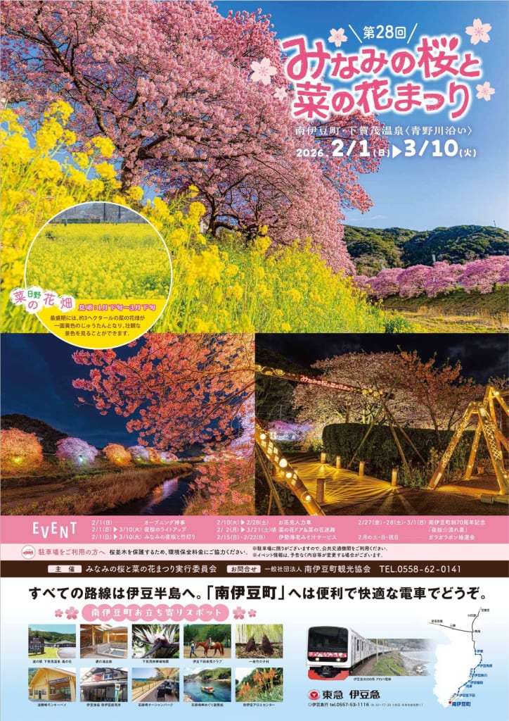 ・会場:静岡県賀茂郡南伊豆町・青野川沿いの桜並木、および「日野の菜の花畑」「道の駅 下賀茂温泉 湯の花」周辺など